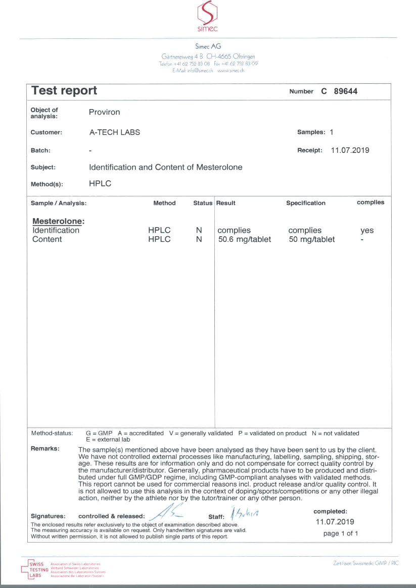 - Product and Laboratory: Mesterolone (Proviron) by A-Tech Labs